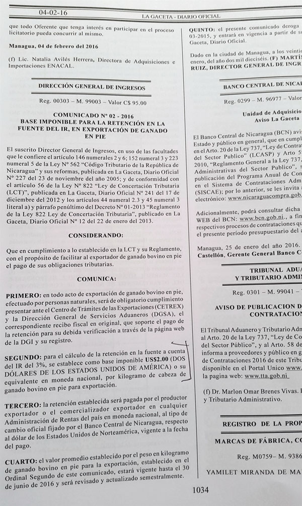 El cuatro de febrero la DGI emitió en el diario oficial La Gaceta el comunicado 02-2016, en el que establece que la “retención establecida será pagada por el productor exportador o el comercializador exportador en cualquier administración de rentas del país”.