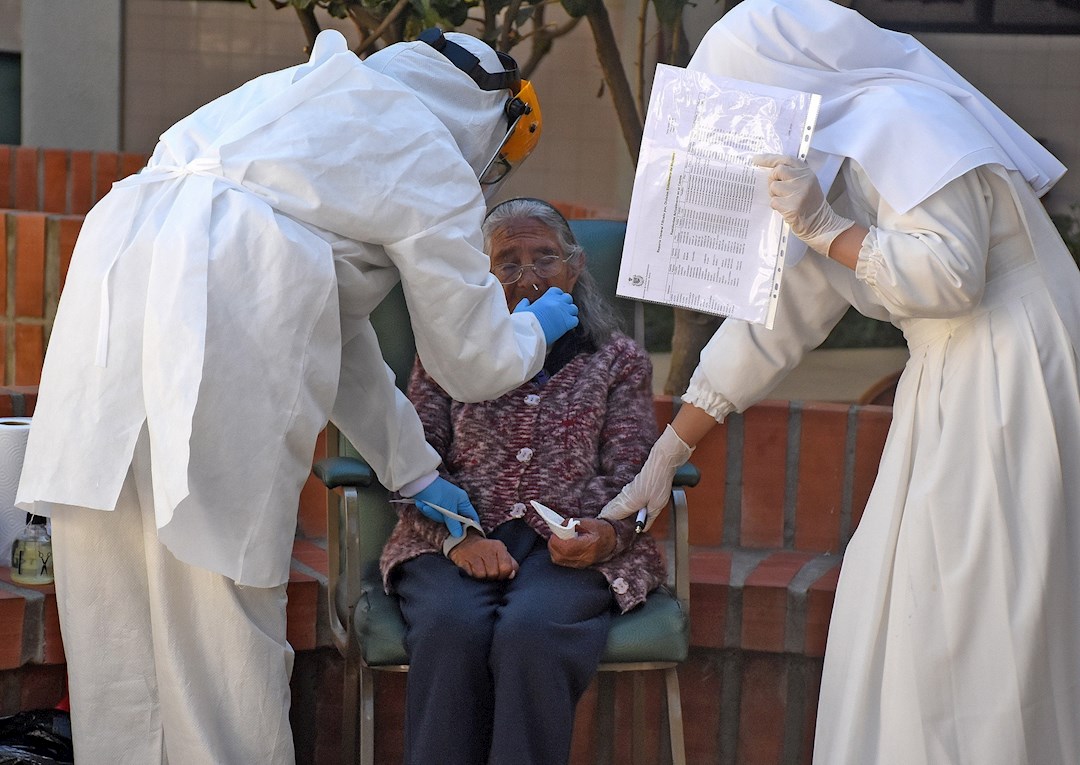Personal de salud realiza pruebas para detectar casos de la Covid-19 en el Hogar San José de la tercera edad, este viernes en Cochabamba (Bolivia) Foto:. EFE/Jorge Ábrego