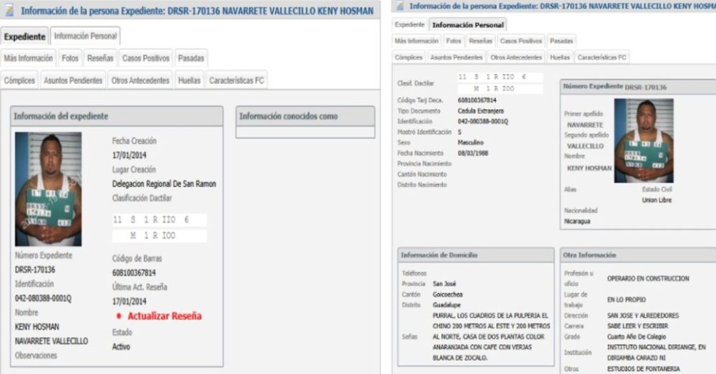 Imágenes del nicaragüense Keny Hosman Navarrete Vallecillo, incluidas en una ampliación del expediente judicial de la OIJ sobre el crimen de Roberto Samcam. | Foto: Captura de pantalla expediente del OIJ de Costa Rica.