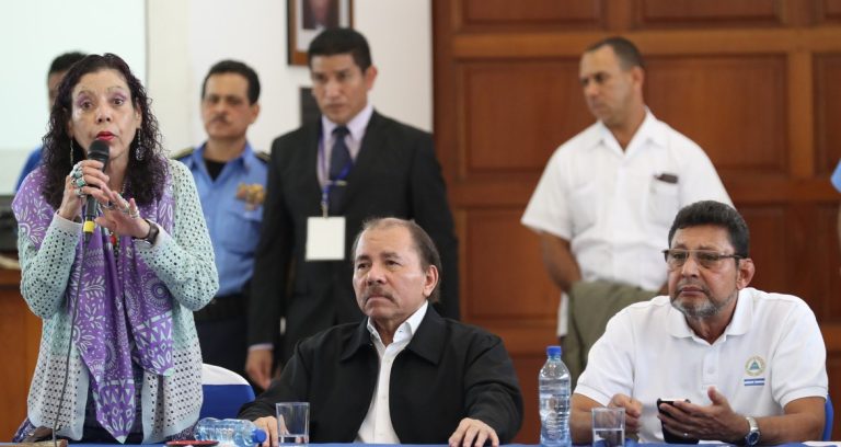 El ex asesor presidencial, Bayardo Arce Castaño (der.), sentado al lado de Daniel Ortega y Rosario Murillo, durante el primer día del Diálogo Nacional, el 16 de mayo de 2018. | Foto: CCC
