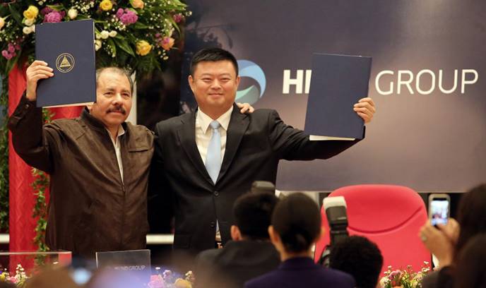 Nicaraguan President Daniel Ortega and Wang Jing hold the signed documents of the framework agreement for the construction of the Interoceanic Grand Canal. Managua Nicaragua on June 14, 2013. Photo: AFP/Inti Ocon
