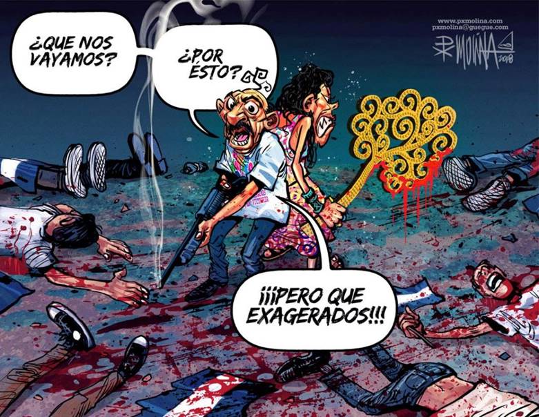 In this drawing, Molina portrays the presidential pair clinging tightly to power despite the killing spree they’ve unleashed. The government at this time still only recognizes 198 deaths, all of which they blame of the demonstrators.