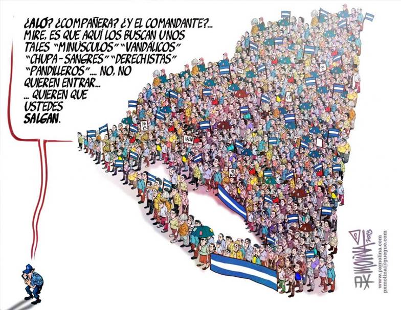 The cartoon portrays how all over Nicaragua during these past five months thousands of people have stood up in protest to demand the resignation of Ortega as well as Murillo.
