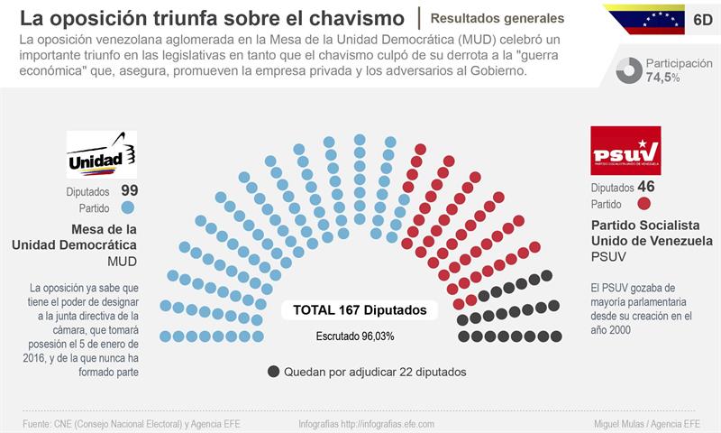 Con lo resultados que se conocen a esta hora, los diputados de la MUD ya tienen asegurada la mayoría absoluta en la Asamblea Nacional que se instalará el 5 de enero de 2016. Cuando se conozcan los resultados definitivos, podrían incluso haber obtenido la mayoría calificada.