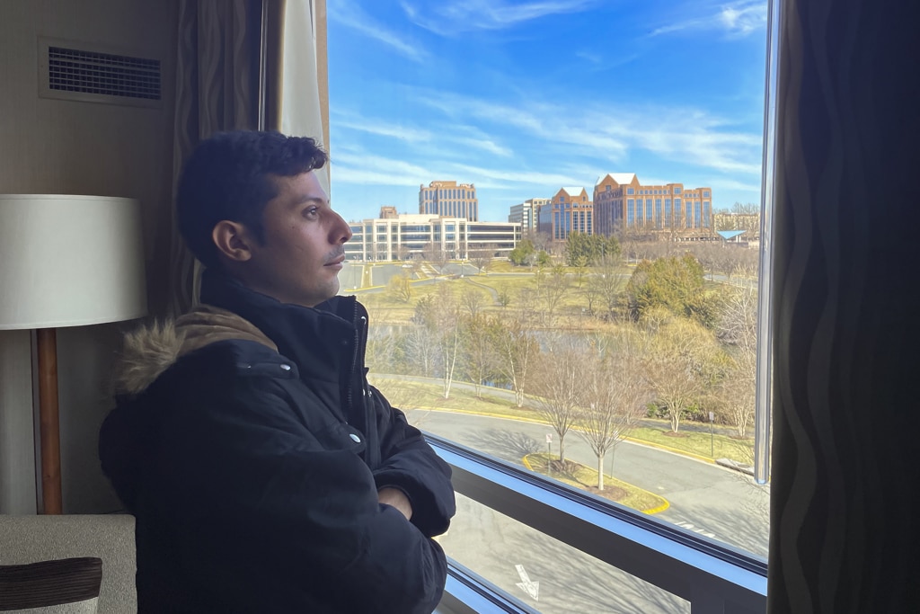 El nicaragüense Yader Parajón observa por la ventana de una habitación de un hotel en Washington. Foto: EFE / Paula Escalada
