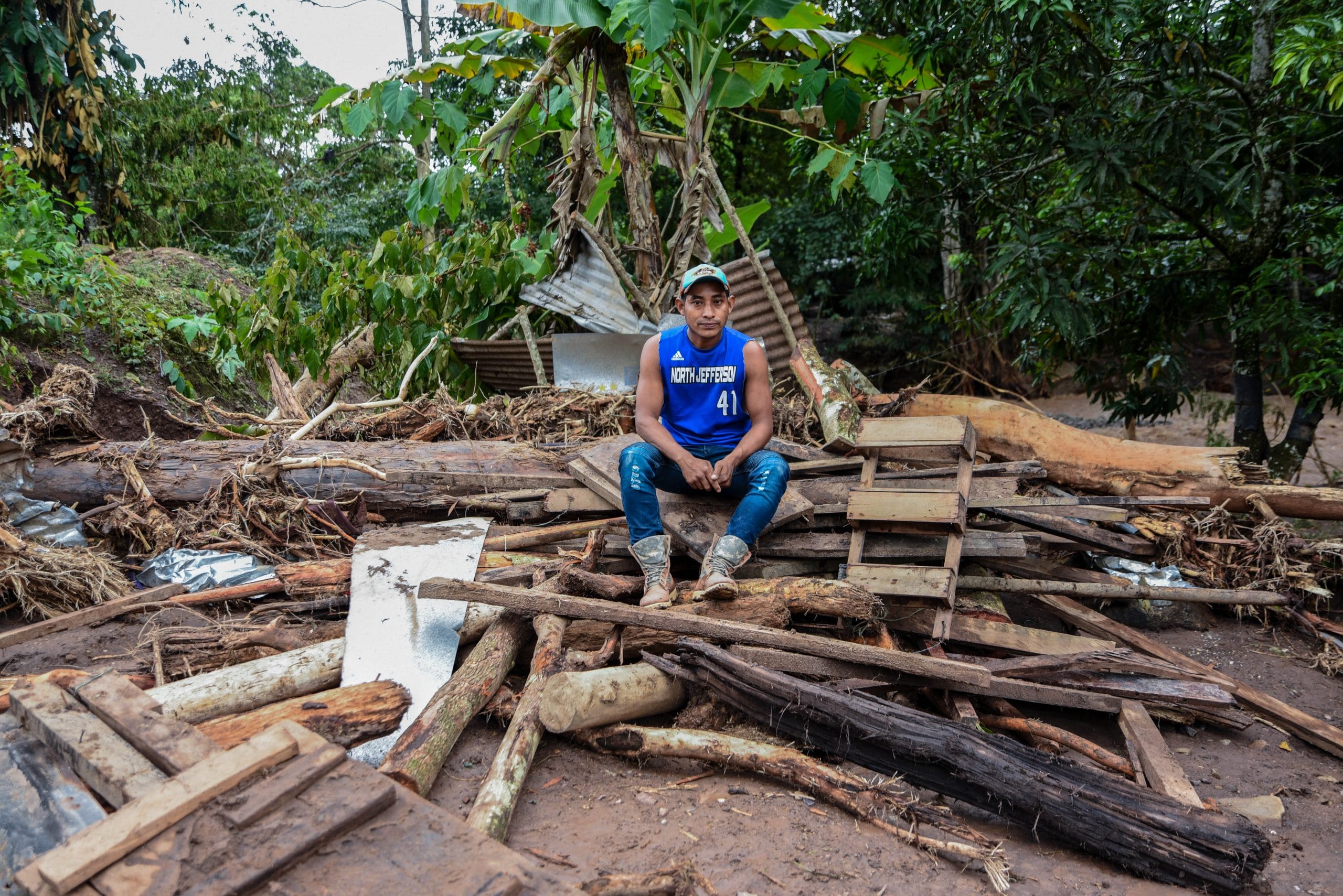 Eliezer Méndez posa sobre los escombros de la casa donde vivía con su esposa e hijos, cuando ocurrió la riada no se encontraba nadie en la vivienda. Nayira Valenzuela | Confidencial