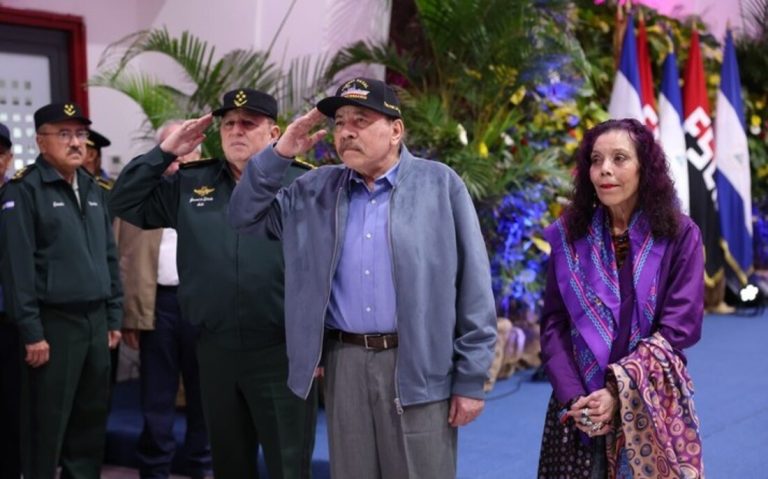 Daniel Ortega y Rosario Murillo (centro y derecha) asisten a un acto de la Fuerza Naval del Ejército de Nicaragua, el 12 de agosto de 2025. | Foto: CCC