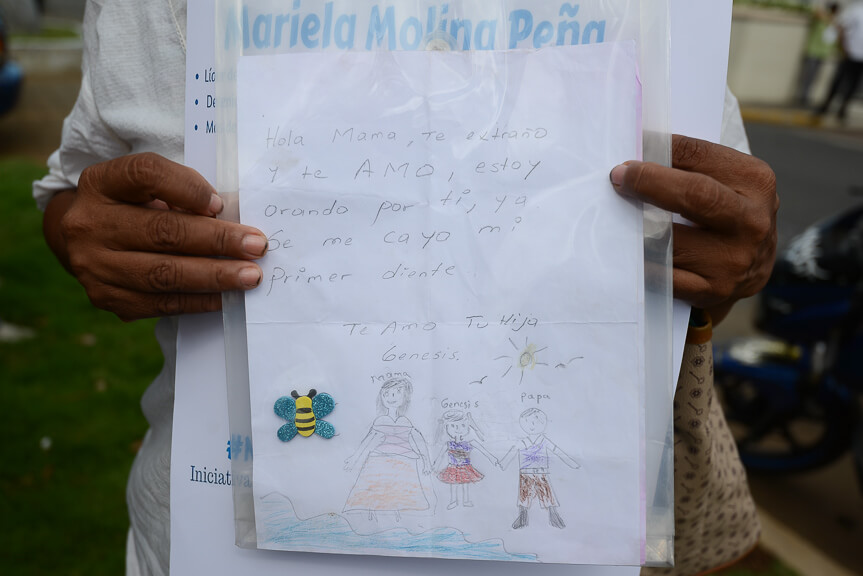 “Hola mamá, te extraño y te amo, estoy orando por ti. Ya se me cayó mi primer diente”, reza la carta que María Peña sostiene entre las manos. La misiva, escrita por su nieta de seis años y dirigida a Mariela Molina, es uno de los recursos que Peña usó para “demandar la libertad” de su hija en un plantón protagonizado este viernes por un grupo de mujeres que se apostaron frente al edificio del Grupo Pellas, en Carretera a Masaya.