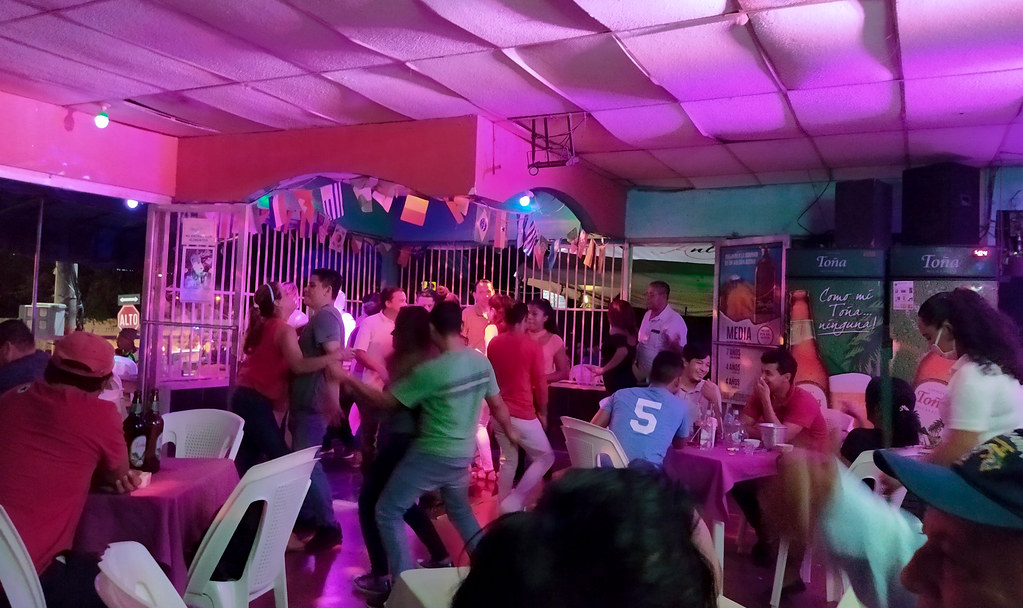 Unas 50 personas están en un bar de la zona periférica de Managua, esta vez hay personas adultas de 50 años de edad bailando y bebiendo. Hay mesas hasta en la acera y todas están ocupadas.