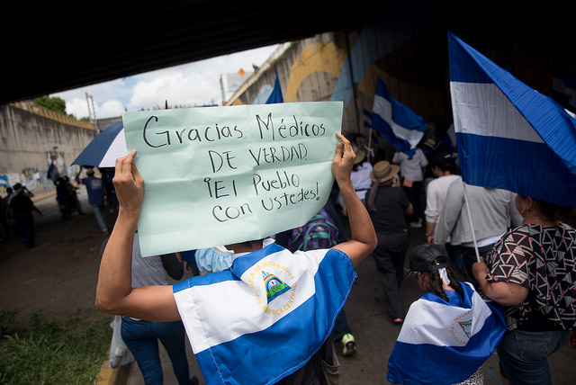 En Managua, cientos de médicos protestaron en contra de los despidos de sus colegas. La doctora María Miranda Molina llegó a la marcha en solidaridad con sus colegas vestida con una bata de médico mientras en su mano portaba una bandera de Nicaragua. “No es posible que nos despidan por salvar vidas, si ese es mi trabajo y para eso nos contrataron”, manifestó. Para ella, el juramento hipocrático, aquel que realizan todos los doctores antes de graduarse, no debe incumplirse por ningún profesional de la salud.