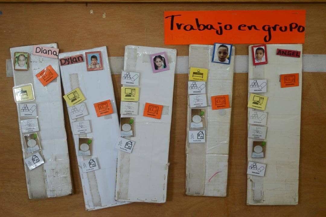 Cada niño tiene una tabla de trabajo. En cada imagen se les indica qué actividad deben realizar. Una vez que la terminan la quitan de la regla y colocan otra. Esta rutina la trasladan a sus casas. Confidencial/CarlosHerrera