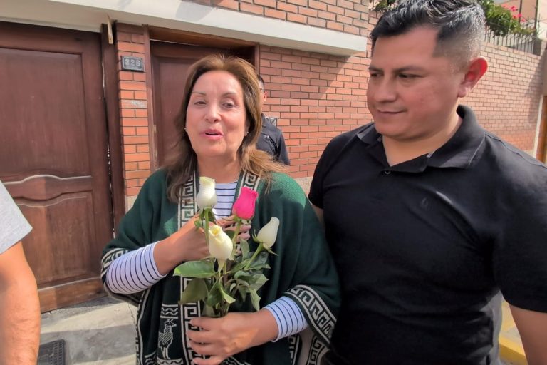 La expresidenta de Perú, Dina Boluarte, habla con simpatizantes en las afueras de su vivienda en Lima, el 11 de octubre de 2025. | Foto: EFE/Fernando Gimeno