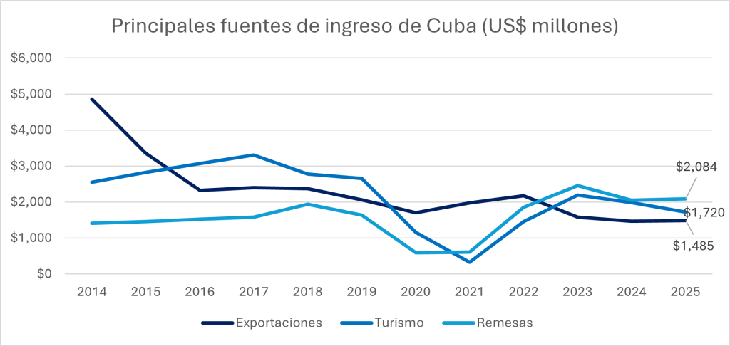 En Cuba los cuentapropistas son 1.5 millones de microempresarios y generan menos de U$3000 anuales; los empleados públicos viven con menos de 50 dólares al mes y suman menos de 2 millones; y luego están los del sector informal, que también viven del turismo y de lo que puedan agenciarse, pero sus ingresos también son inferiores a U$3000. Muchos de estos reciben remesas para compensar el déficit de sus ingresos. Pero frente a una dependencia de las exportaciones, el turismo y las remesas, la disminución gradual de éstas genera una reducción de la capacidad importadora y de satisfacer las necesidades de la población.