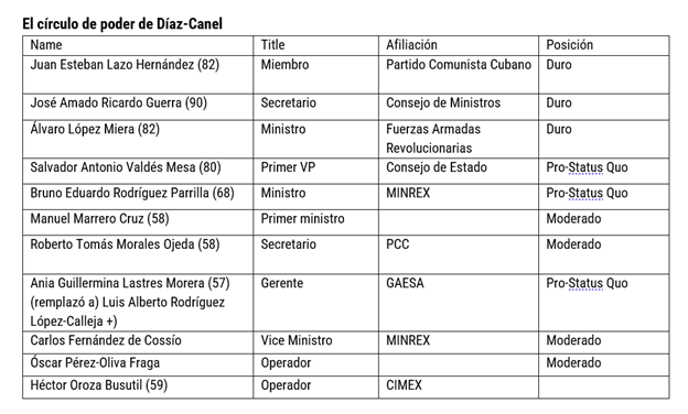 Entre la crisis económica, ya en marcha antes de la pandemia, y la sanitaria, Díaz-Canel tuvo que afrontar las presiones internas de la vieja guardia del politburó y del Partido Comunista. El politburó refleja una brecha generacional, cuenta con una sobrerrepresentación de cuadros veteranos, muy leales a los Castro, y desconfía de los líderes más jóvenes.