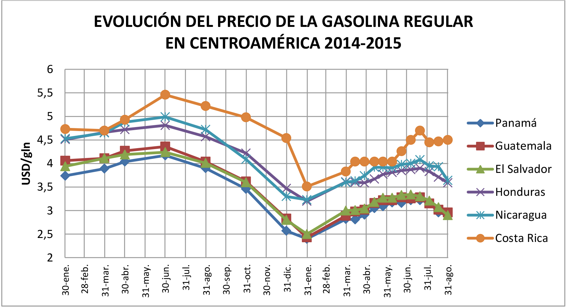 Veamos la evolución comparativa del precio de la gasolina en cada país de Centroamérica, conforme a datos del Comité de Cooperación de Hidrocarburos de Centroamérica (CCHC). El alto precio de los derivados en Costa Rica (y en los países nórdicos y similares) se debe exclusivamente al porcentaje alto de los impuestos. En Europa, los impuestos representan más del 50% del Precio de Venta al Público. En Costa Rica, este rubro representa el 30.6 % del Precio de Venta al Público (PVP), mientras en el resto de países de Centroamérica los impuestos representan en promedio el 20.92 %. Exceptuando a Costa Rica, Nicaragua presenta el precio más caro de los derivados del petróleo (salvo entre agosto de 2014 y enero de 2015, que el precio descendió, ligeramente, por debajo de el de Honduras). Ello (exclusivamente en nuestro país) no se debe a los impuestos ¿A qué se debe entonces? Lo veremos más adelante, escarbando debajo de los nancites y jocotes.