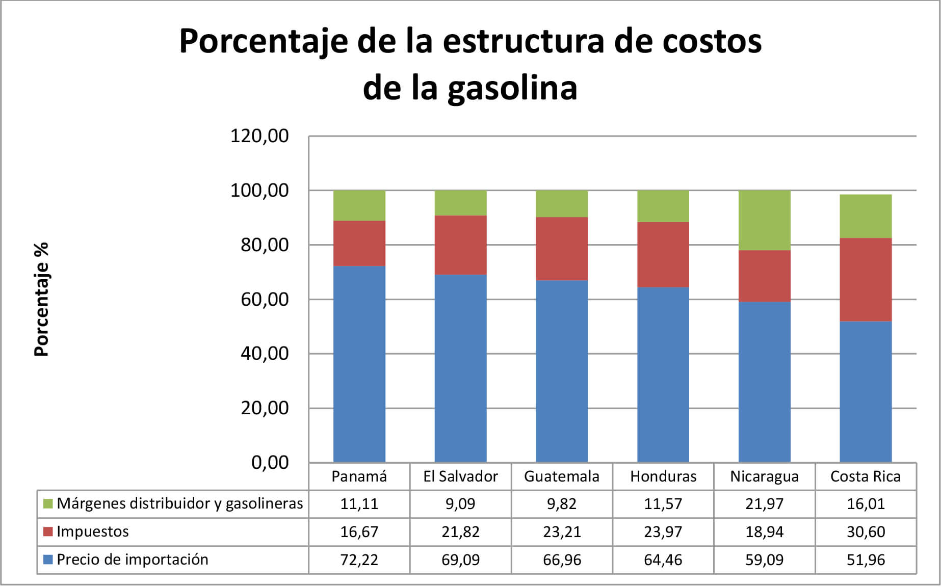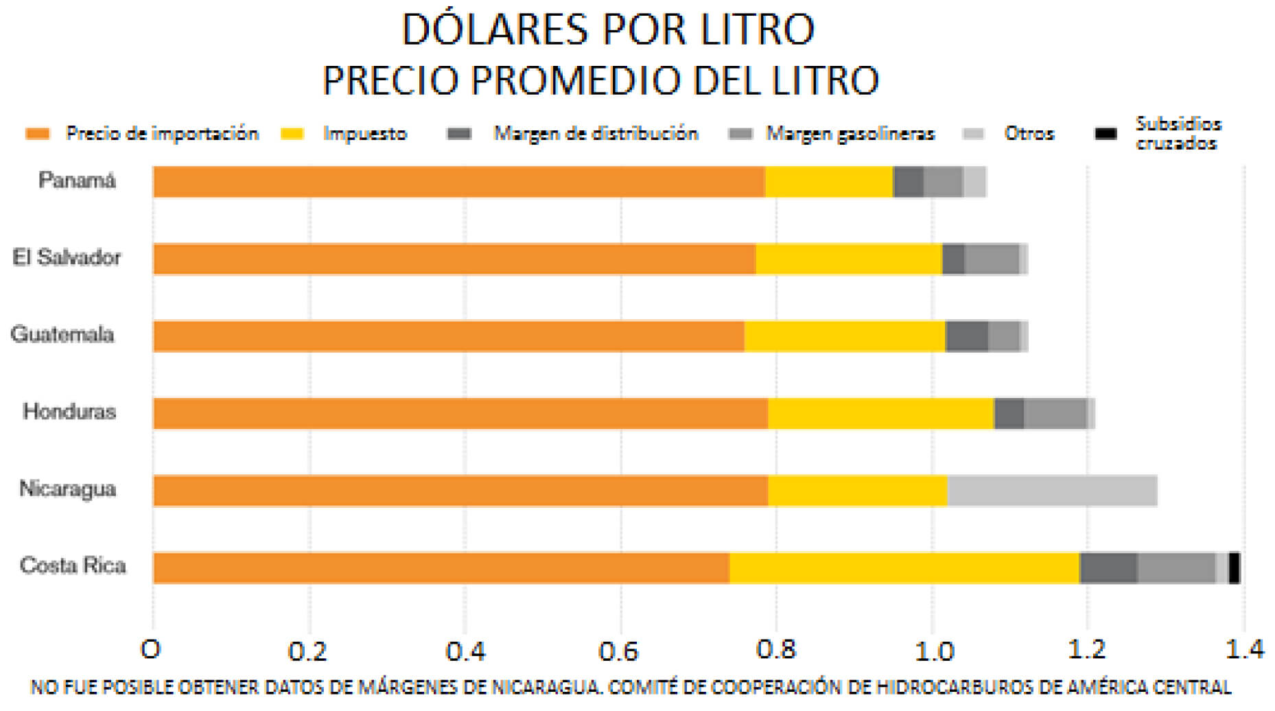 Sin embargo, este costo representa en Nicaragua el 59 % del Precio de Venta al Público (PVP) de la gasolina. En la región, este costo representa, en promedio, el 63.96 % del PVP. Ello significa que el resto de componentes de la estructura de costos del PVP, que corresponden a las políticas de formación de precios de cada país, son bastante más caros en Nicaragua que en el resto de la región (salvo Costa Rica). ¿Cuánto más caro? Lo veremos adelante.