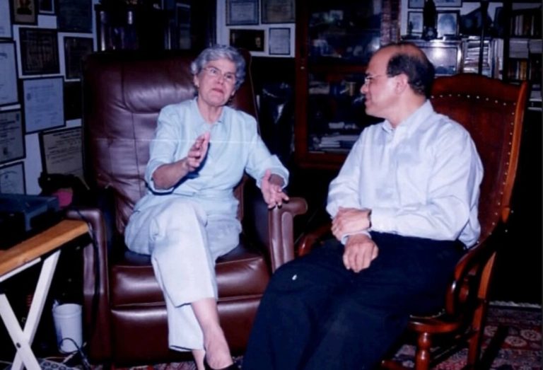 Doña Violeta Barrios de Chamorro conversa con el investigador nicaragüense Andrés Pérez-Baltodano. | Foto: Cortesía