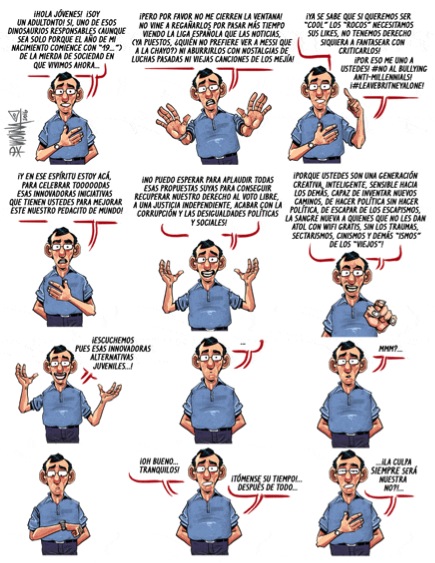 Sobre estos hallazgos vamos viendo distintas posturas, una es culpar y echar en cara a las juventudes actuales su falta de compromiso social y político, su apatía y desinterés hacia el país y la sociedad y se usa como ejemplo la militancia y el sacrificio de los y las jóvenes que lucharon en la guerra de los setentas y los ochentas –esta caricatura de Molina publicada en el Confidencial es un buen ejemplo: