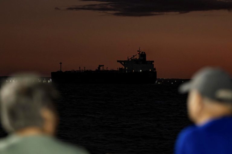 Un par de ciudadanos observan un buque petrolero en Maracaibo, Venezuela, el 24 de enero de 2026. | Foto: EFE/Henry Chirinos