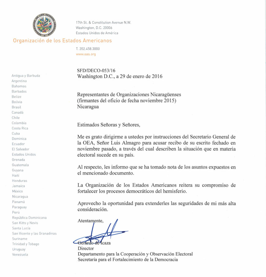 El director del Departamento para la Cooperación y Observación Electoral la Organización de Estados Americanos (OEA), Gerardo de Icaza, respondió a una carta enviada desde Nicaragua por organismos de la Sociedad Civil y partidos políticos de oposición, en la que demandan acompañamiento electoral del organismo para los comicios generales a celebrarse en noviembre de 2016.