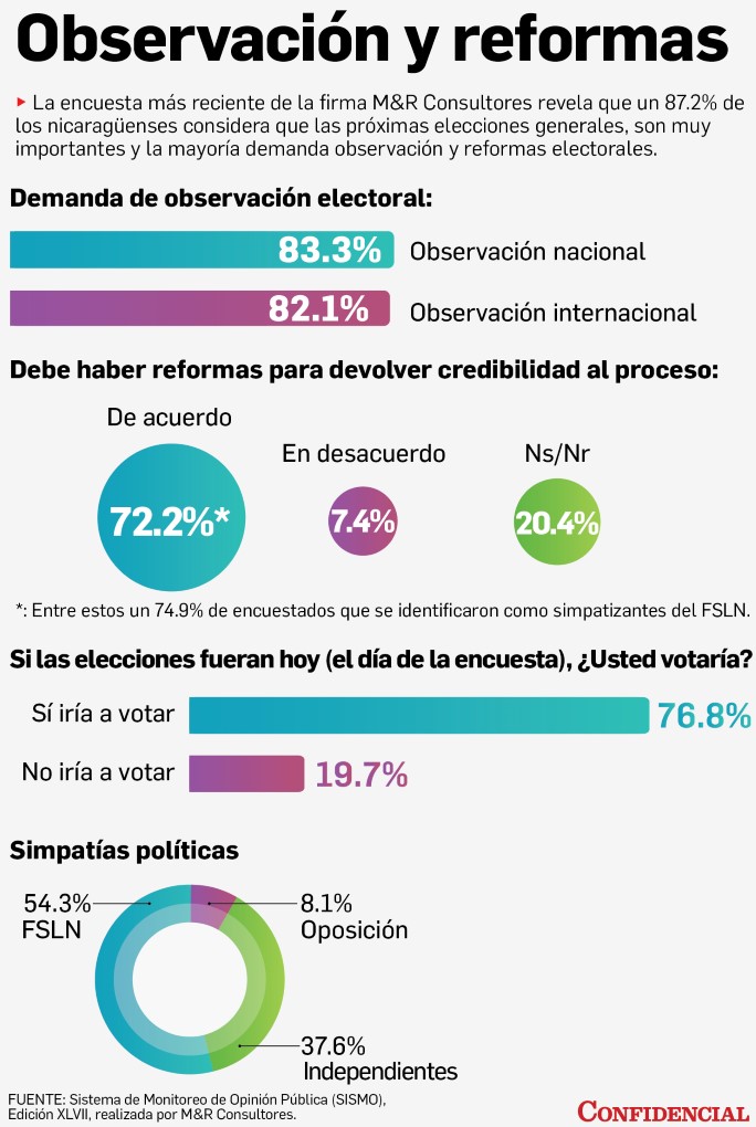 La encuesta de M&R Consultores fue presentada el martes con los comentarios del analista político Arturo Cruz y el exalcalde de Managua por el FSLN, Dionisio Marenco, quienes coincidieron en la importancia y necesidad de garantizar la observación electoral.