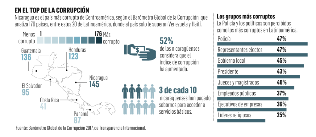 El Índice Global de Corrupción de TI ubica a Nicaragua en la posición 145 de 176 países analizados a nivel mundial.Transparencia Internacional encuestó entre mayo y diciembre de 2016 a más de 22 mil 300 ciudadanos en veinte países de América Latina y el Caribe, para conocer sus experiencias directas de corrupción en los servicios públicos y sus percepciones sobre la magnitud de la corrupción.