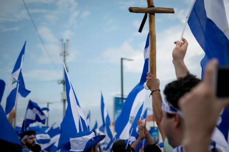Ciudadanos nicaragüenses sostienen banderas nacionales y cruces durante una manifestación en Managua, en mayo de 2018. | Foto: Archivo